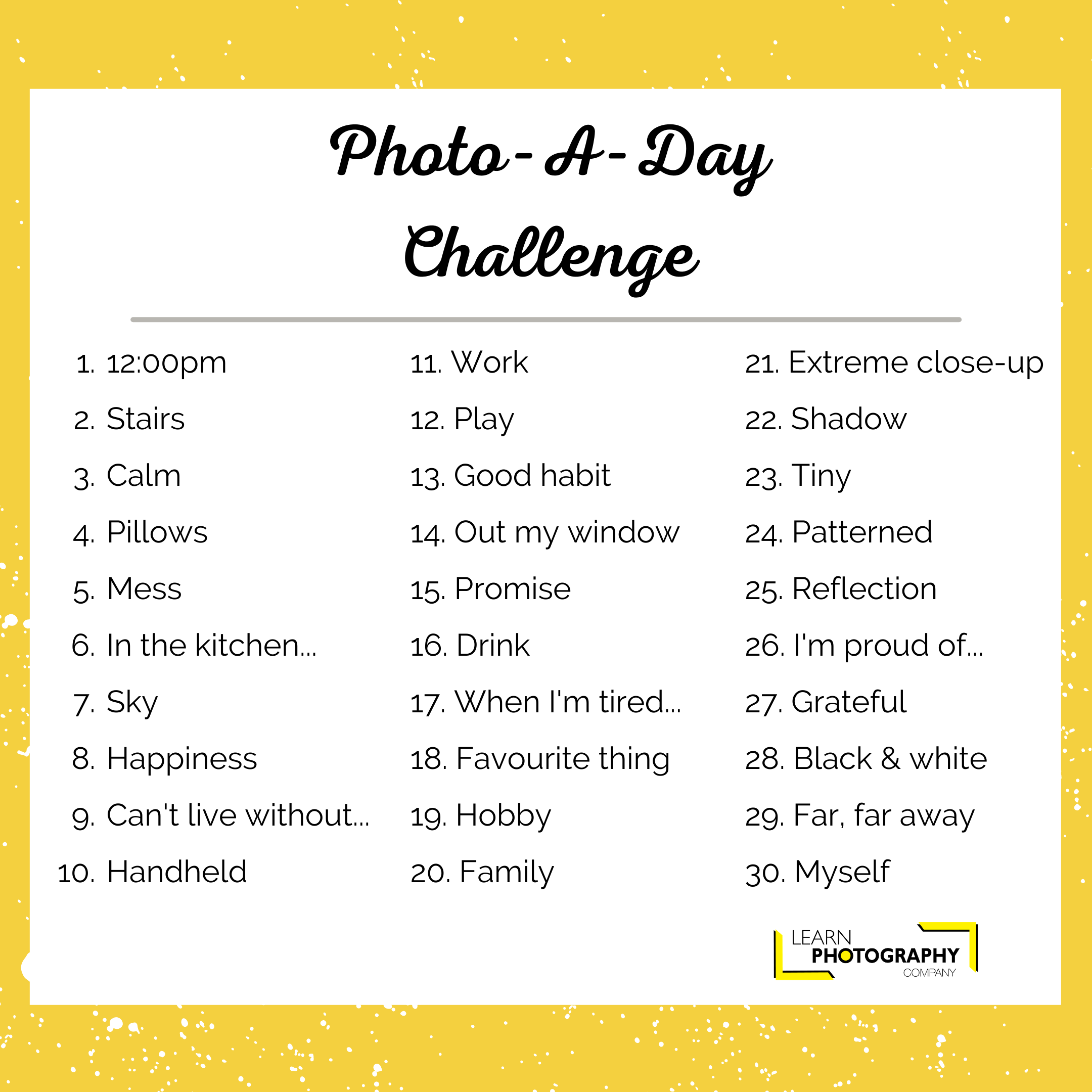 Here's an incredible 30 Day Photography Challenge to get you started.