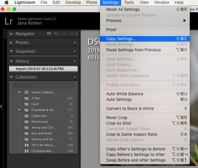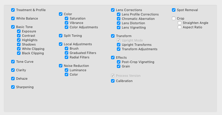 - Choose your options for the settings to copy (for example, you may not want to copy the crop you did on the main photo, but you do want to copy everything else).