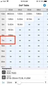 1. You can use a Depth of Field calculator to see how far away you need to focus to keep your photo crisp and clear. For example, with Astrophotography, I would dial in the following settings (for example): Camera: Canon Rebel T6i, Lens: 16-35mm, Focal length: 16mm, f.stop 2.8. At these settings, my table is telling me that if I focus at least 7 meters away from me, my stars will also be in focus. (Check out our Digital III – Landscape & Travel course in Banff to learn more about this).