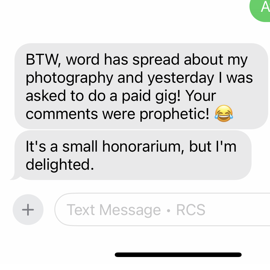 That’s where photography comes in. The image below is a screen print of a text from Jessica, a student of mine in Calgary. She LOVES photography and she’s thrilled that people are starting to pay her to do it!
