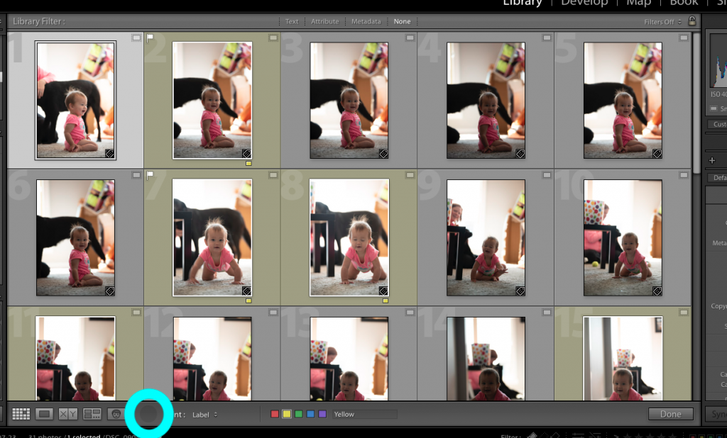 Step 4: Click on the photos you wish to paint these parameters to. You can click and hold down to select multiple photos at once, or just click on each individual photo. Note, you don’t have to press enter, or anything else – just clicking on the photo will spray those parameters on. Below you can see what our grid looks like now that we have painted the colour yellow.